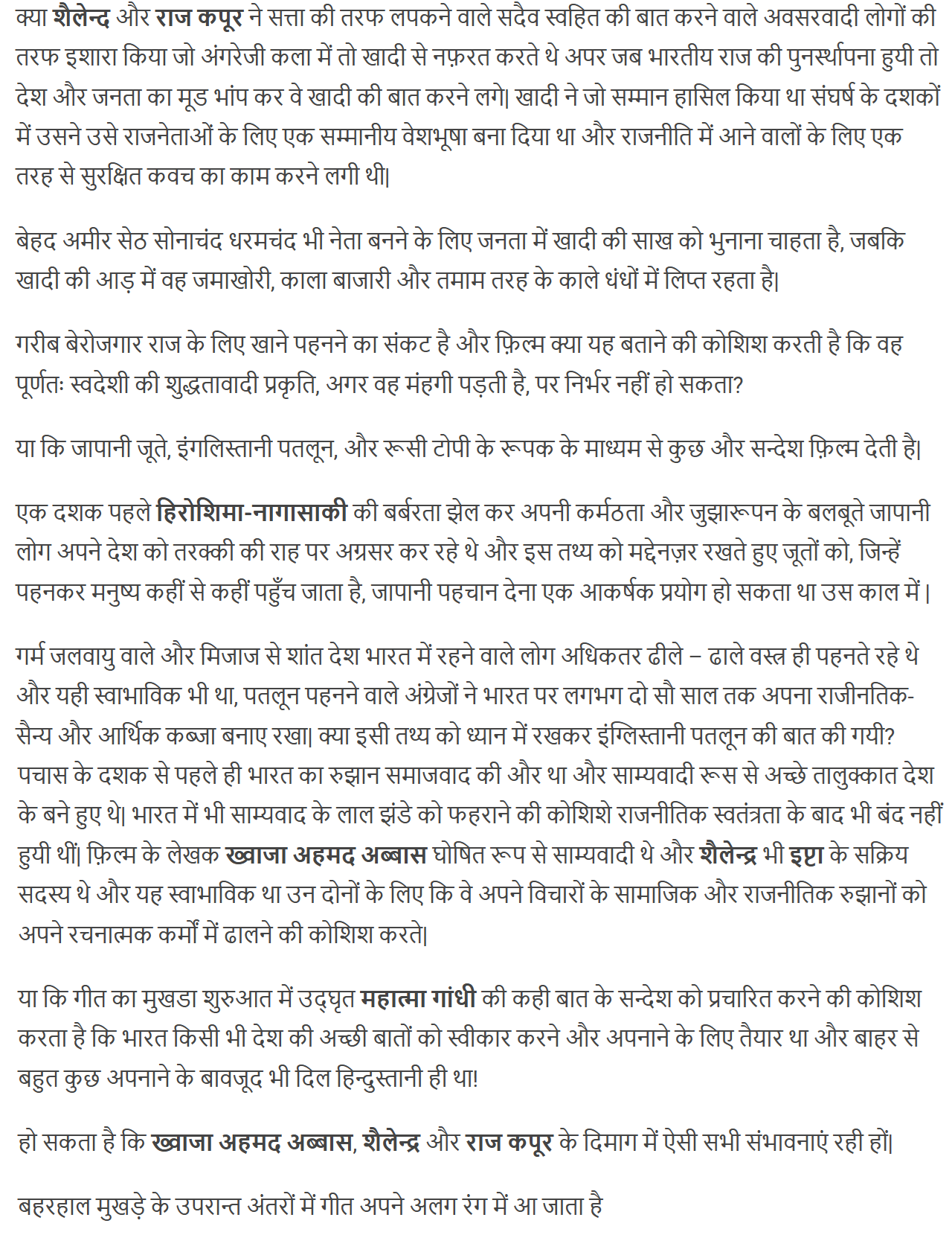 सेठ सोनाचंद धरमचंद बड़े फख्र से अपनी पोशाक का जिक्र करता है और कहता है सर से पाँव तक वह खादी के वस्त्र धारण किये हुए है और वह पूर्णतः स्वदेशी की बात छेडता है| दूसरी और राज जनता को अपनी लगभग फटेहाल वेशभूषा का परिचय गीत के मुखड़े के रूप में ही देता है|