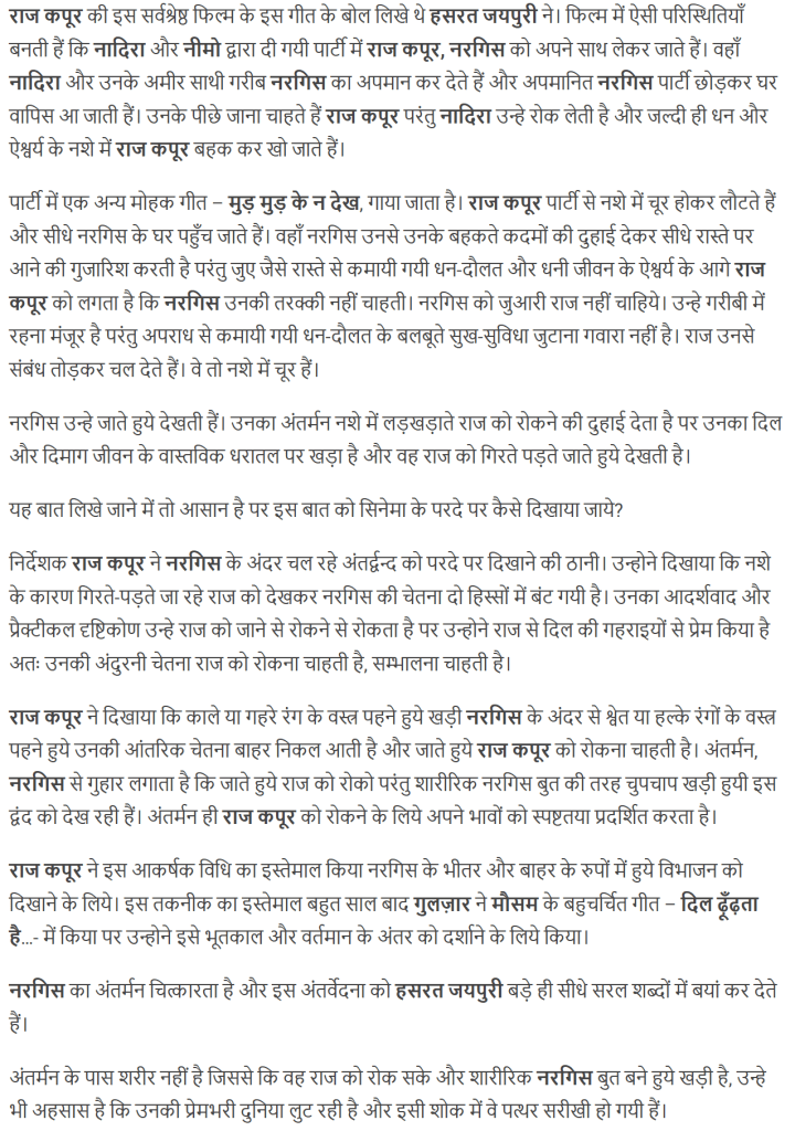 चाहे वह आवारा का ड्रीम सीक्वेंस हो या श्री 420 के इस गीत का तकनीकी पहलू हो, राज कपूर अपने फिल्मी जीवन में हिन्दी सिनेमा को बहुत सारे क्षेत्रों में दिशा प्रदान करते रहे।