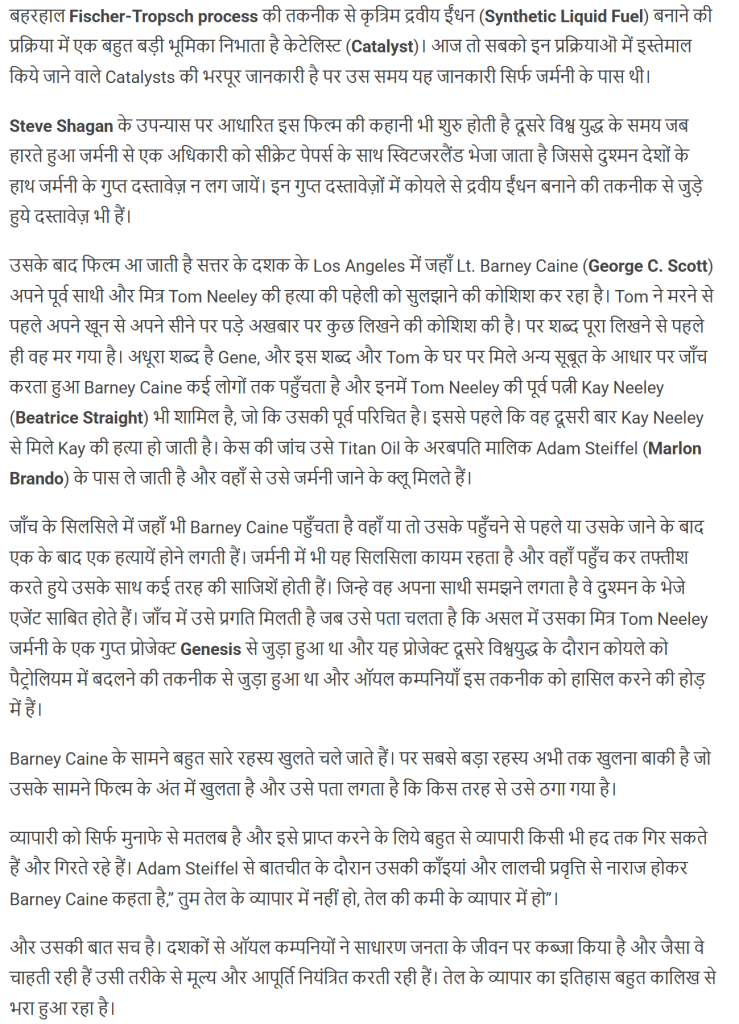 Afganistan, Alternative Fuel, Beatrice Straight, Berlin, Bio-Oil, Biomass, Carbon mono oxide, Chemical Engineering, Chhattishgarh, China, Cinemanthan.com, Coal, De-sulfurization, East Germany, Fischer–Tropsch process, France, Franz Fischer, G.D. Spradlin, George C. Scott, Germany, Hamburg, Hans Tropsch, Hydrogen, India, Indo-China war 1962, Iran, Iraq, Japan, Jharkhand, John G. Avildsen, John Gielgud, Kaiser Wilhelm Institute, Liquid Fuel, Los Angeles, Marlon Brando, Marthe Keller, Mechanical Engineering. Catalysts, Orissa, Petroleum, Rakesh, Refining, Renewable Energy, Romania, Russia, Steve Shagan, Syngas, Synthetic Fuel, The Formula, The Formula (1980), United States of America, USA, World War II
