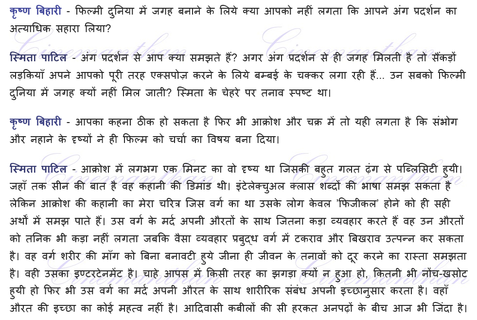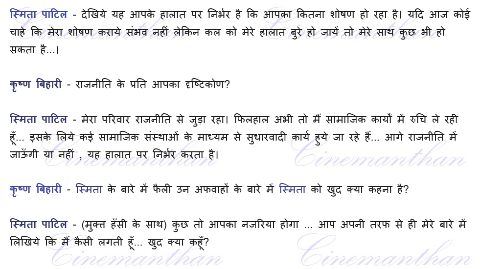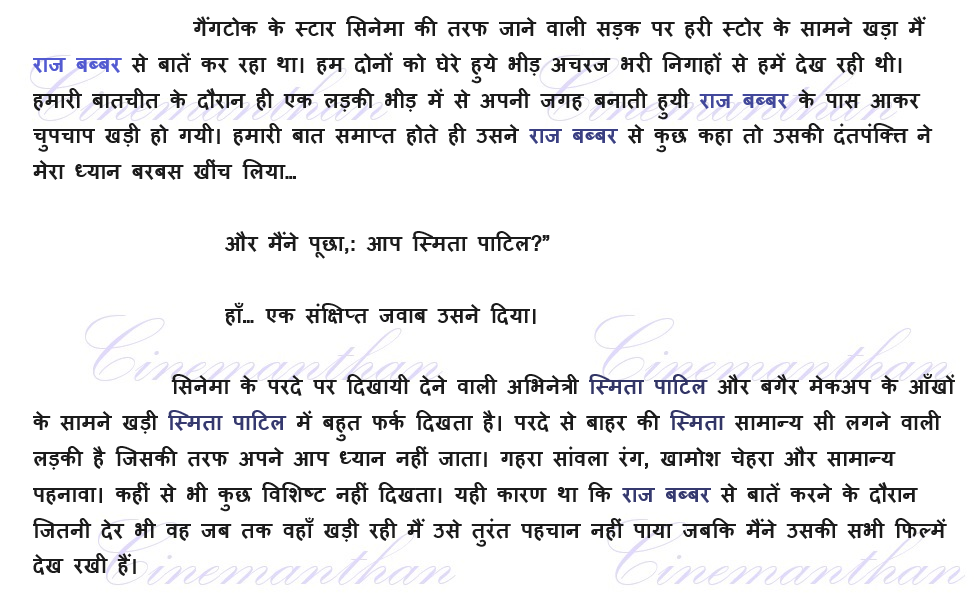 नवम्बर 1985 में हिन्दी के सुप्रसिद्ध साहित्यकार श्री कृष्ण बिहारी ने भारतीय सिनेमा की अदभुत अभिनेत्री स्मिता पाटिल से गैंगटोक में हुयी अपनी मुलाकातों के आधार पर यह संस्मरण लिखा था।