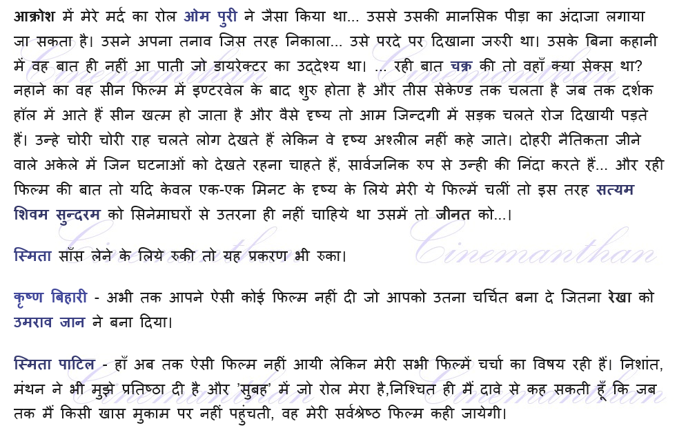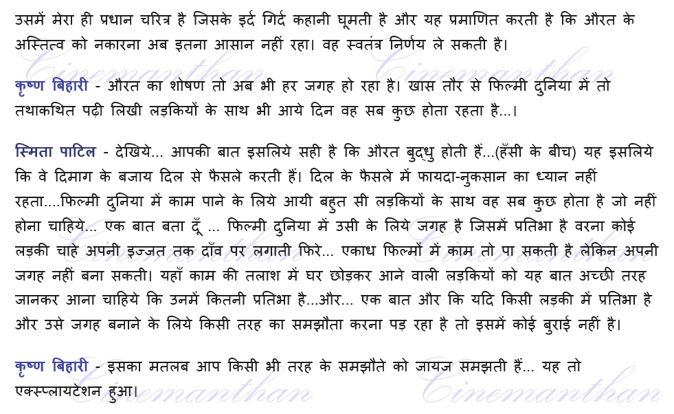अभिनेत्रियाँ तो स्मिता पाटिल से पहले भी बहुत आयीं और बाद में भी पर भारतीय सिनेमा में सबसे ज्यादा कमी किसी अभिनेत्री की खलती है तो वह स्मिता पाटिल ही हैं।