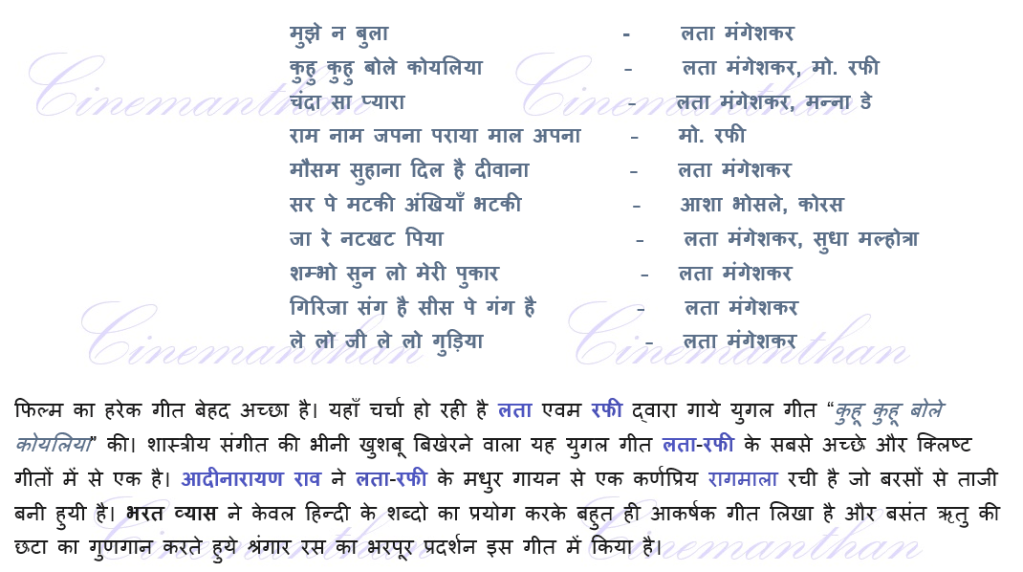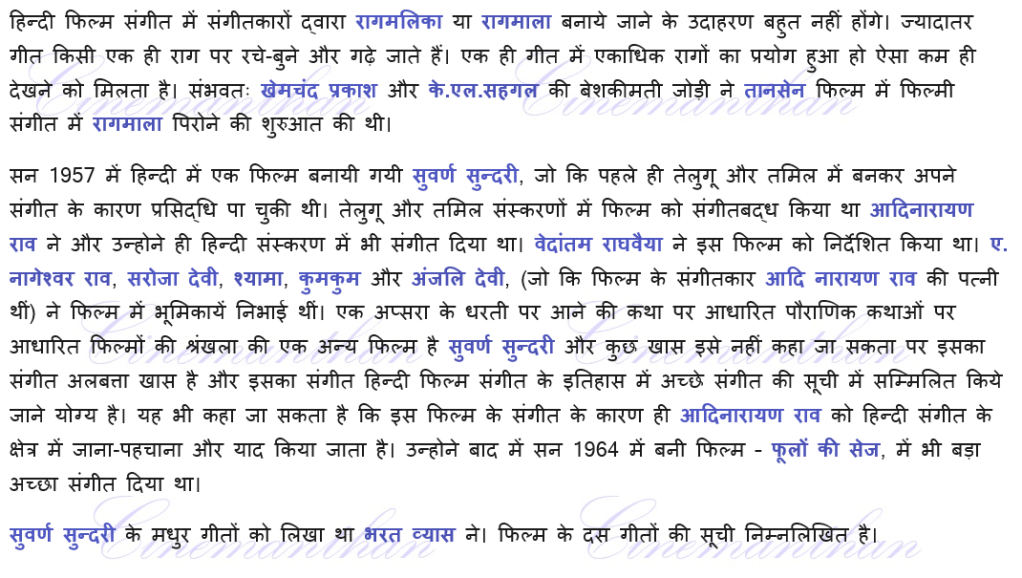 A Nageshwar Rao, Adinarayana Rao, Anjali Devi, सुवर्ण सुन्दरी, Bharat Vyas, Cinemanthan.com, K.L. Saigal, Khemchand Prakash, Kuhoo Kuhoo bole koyaliya, Kumkum, Lata Mangeshkar, Mohd. Rafi, Phhoolon kee Sez (1964), Raga-Adana, Raga-Bahar, Raga-Darbari, Raga-Jaunpuri, Raga-Sohni, Raga-Yaman, Rakesh, Saroja Devi, Shyama, Suvarna Sundari (1957), Tansen, Vedantam Raghavaiah