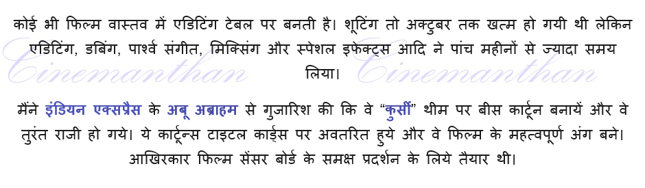 Adil, Amrit Nahata, Apatkaal, Asha Bhosle, किस्सा कुर्सी का, Becket (1964), Chaturvedi, Cinemanthan.com, Congress, Emergency in India, FFC, Ford Foundation, FTII, Hans, Indira Gandhi, Janta Party, Kissa Kursi Ka, KK Mahajan, Kutub Hotel, LK Advani, Loksabha, Mahendra Kapoor, Manohar Singh, Morarji Desai, MP, New Delhi, Om Shiv Puri, Parliament, Peter O’Toole, Phir Bhi, Raghunath Seth, Rajendra Yadav, Rajyasabha, Rakesh, Rawat, Rehana Sultana, Sabse Bada Sawaal, Sanjay Gandhi, Sant Gyaneshwar, Shivendra Sinha, The Miser