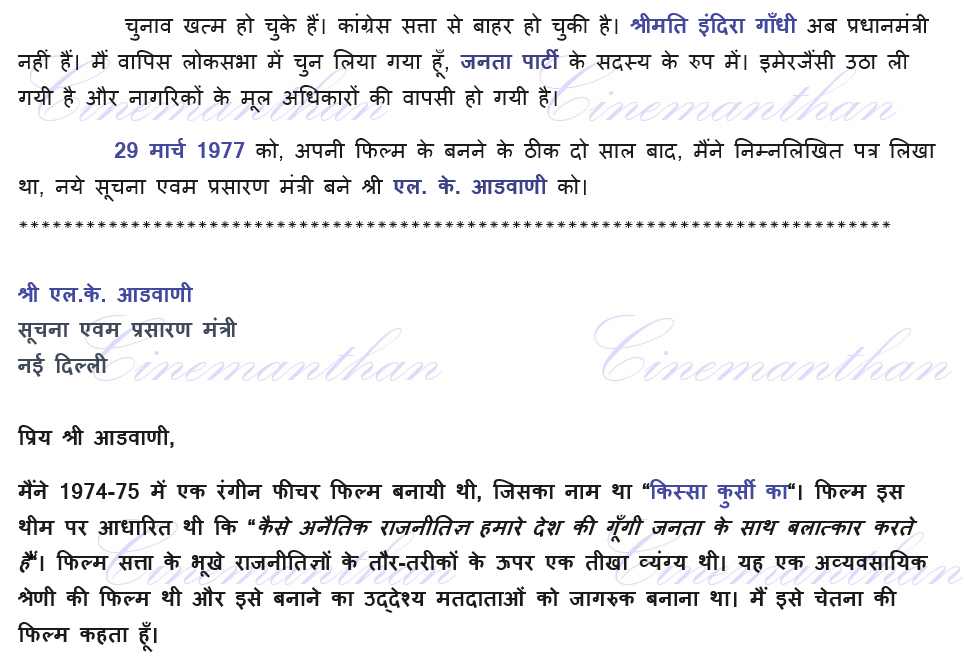 नोट: शैक्षणिक व अव्यवसायिक उपयोग के लिये हिन्दी सिनेमा के इतिहास से सम्बंधित एक विवादास्पद फिल्म के निर्माता के पत्र का हिंदी रुपांतरण प्रस्तुत किया गया है।