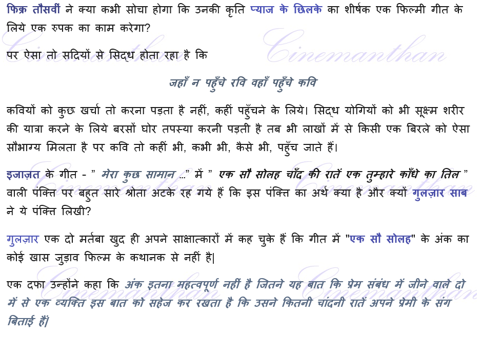 Anuradha Patel, Asha Bhosle, Cinemanthan.com, Dina Pathak, Ek Sau solah chand ki ratein ek tumhare kandhe ka til, gulzar, Ijaazat, Ijaazat 1987, mera kuchh saman tumhare pass pada hai, Naseeruddin Shah, Pancham, Phikr Tausvin, Pyaaj ke Chhilke, Rakesh, RD Burman, Rekha, Shammi Kapoor, Shashi Kapoor, Sulbha Deshpande