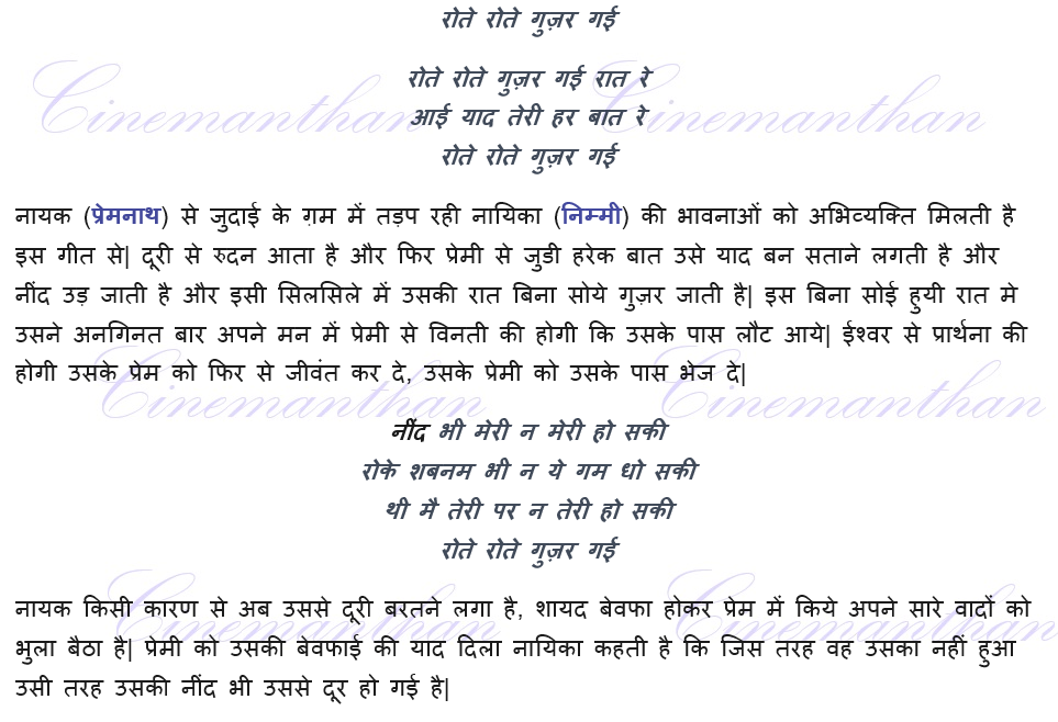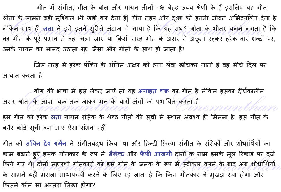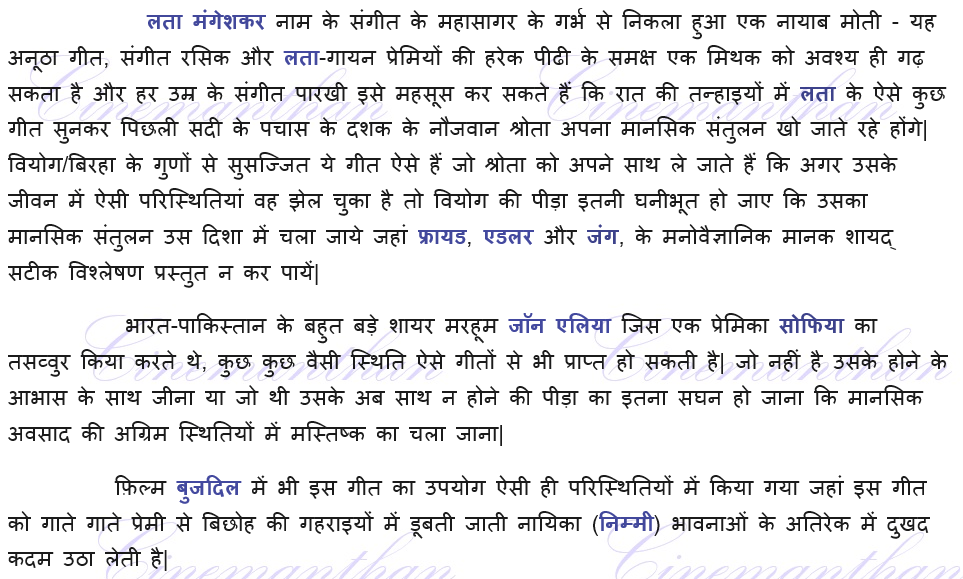 चेतावनी : कमजोर ह्रदय के श्रोता, विशेषकर प्रेम में वियोग झेल रहे व्यक्ति, और ऐसे व्यक्ति जिन्होंने कभी भी जीवन में सच में प्रेम को जीवन में जिया हो, इस गीत को रात की तन्हाइयों में लगातार न सुनें|