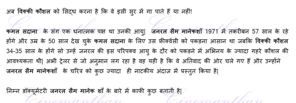फील्ड मार्शल जनरल मानेक शॉ के मूल वीडियोज देखने के बाद फ़िल्म – सैम बहादुर में उनकी भूमिका निभा रहे विक्की कौशल द्वारा अपनाया गया चरित्र चित्रण थोड़े संदेह के घेरे में तो आ ही जाता है| फ़िल्म जनरल सैम बहादुर के प्रति भावनाओं का सैलाब लायेगी और अगर जनरल सैम मानेक शॉ के चरित्र के फ़िल्मी चित्रण में कुछ उंच नीच हो गयी तो उनके करोड़ों भारतीय प्रशंसक विक्की कौशल और मेघना गुलज़ार को कभी क्षमा नहीं करेंगे|