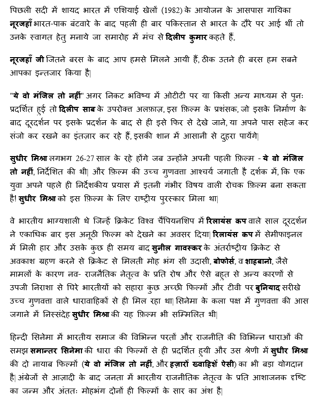 पुनश्च : हाल में ऐसी ख़बरें थीं कि सुधीर मिश्रा ने कहीं कहा है कि वे इस फ़िल्म – ये वो मंजिल तो नहीं, को दुबारा बनायेंगे| ऐसा करने से बेहतर हो कि वे इस फ़िल्म को ओटीटी आदि प्लेटफ़ॉर्मस पर प्रदर्शित करने का प्रबंध कर दें| ये तो 37 साल पहले समय के पटल पर उनके द्वारा किया गया अमिट सिनेमाई हस्ताक्षर है, अब भारतीय राजनीति से संबंधित कोई नई फ़िल्म बनाएं जिससे उनकी त्रयी (Trilogy) पूरी हो जाए|