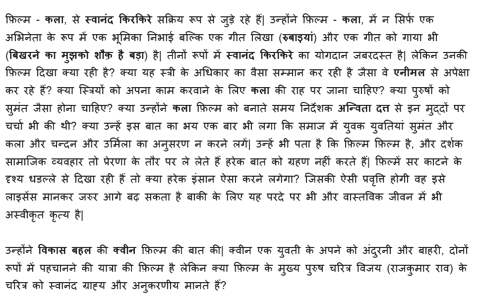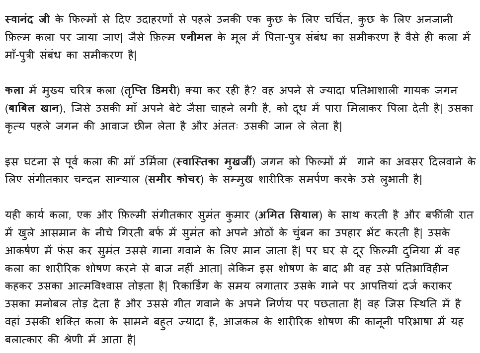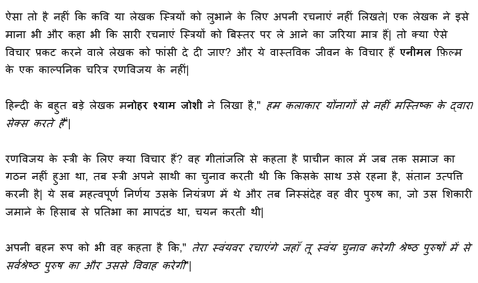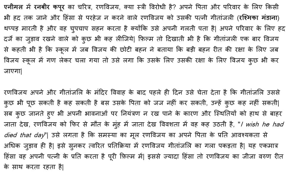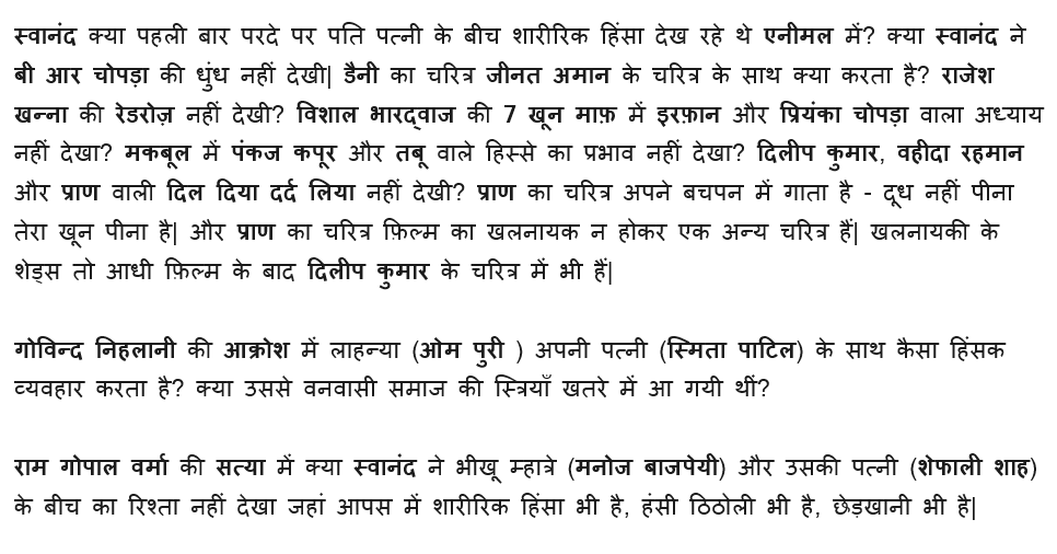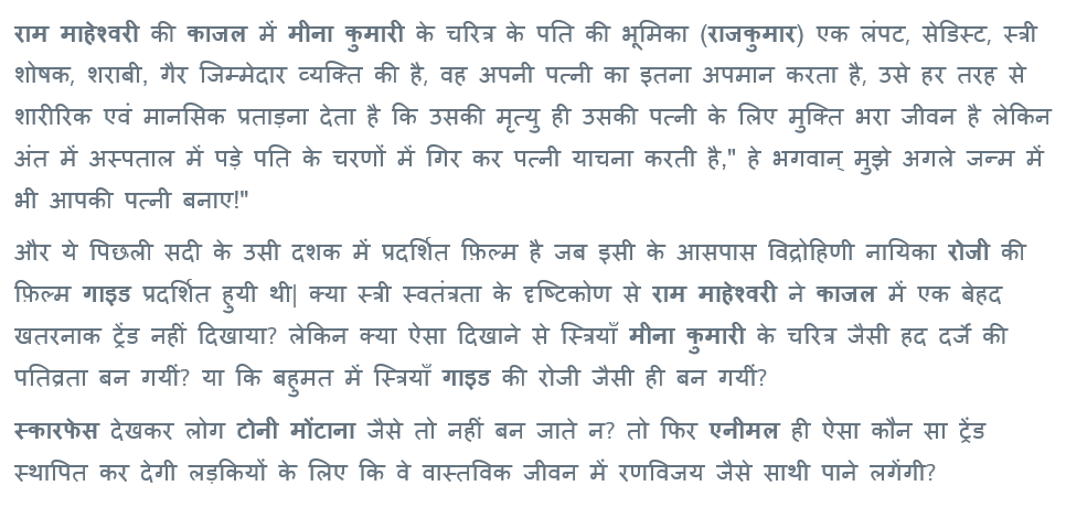 हिंदी फिल्मों में ही ऐसे उदाहरण मिल जायेंगे जहां किसी चरित्र का चित्रण समाज के लिए घातक लगेगा लेकिन फ़िल्में आती हैं चली जाती हैं, समाज अपनी मंथर गति से बदलाव देख,समझ, स्वीकार करके बढ़ता रहता है|