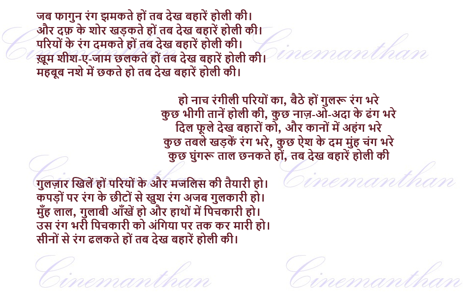भारतीय संस्कृति ने सदा जनमानस में कविता, दर्शन और गायकी द्वारा रंग, उमंग और उल्लासमयी जीवन भरे हैं। अनेकता में एकता के नूर की यह शहदीय बूँद बंटवारे की राजनीति की एंटीडोट है। भारत की मिश्रित संस्कृति के सुनहरे आकाश पर सूफियत और प्रेम के जगमग सितारों में से एक हज़रत नजीर अकबराबादी 18वीं सदी में पुरनूर थे। उनकी रचनायें उस धवल दौर का सच्चा प्रतिबिम्ब हैं जिसमें अन्य सम्प्रदायों के उत्सवों के उल्लास के साथ होली की रंगीनियाँ भी बराबर की भागीदार हैं।