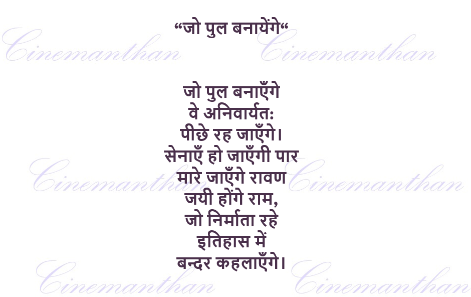 जिन चरित्रों पर इस कविता की नींव पडी है वे सब पुल बनाने वाले इस कविता के अर्थ से उलट यहाँ तो पार्श्व में न रहे बल्कि राम संग के कारण मानव इतिहास में अमर हो गए| राम भक्त हनुमान को छोड़ दें जो राम की भक्ति में लीन हो उनकी प्रतीक्षा कर रहे थे, बाकी सारे वानर प्रजाति के चरित्र तो बस ऐसे ही जीवन व्यतीत कर रहे थे और ऐसे ही मानव स्मृति से लोप हो जाते अगर राम द्वारा रावण के विरुद्ध सभ्यता संघर्ष युद्ध में उनका साथ न देते| कभी बाली तो कभी रावण सरीखा कोई बलवान उन्हें प्रताड़ित करता ही रहता|