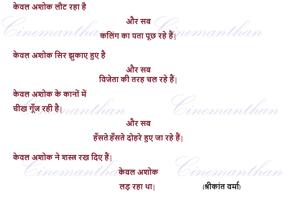 कवि श्रीकांत वर्मा ने अशोक, जिसे दुनिया कलिंग में भयंकर नरसंहार करके विजय प्राप्त करने वाले चक्रवर्ती सम्राट अशोक के रूप में याद रखती है, और जिसे इसलिए भी इतिहास याद रख पाया है कि उसने हिंसा को छोड़ा तो अहिंसा को गले लगा लिया, के बहाने इसी पूर्ण समाहित होने की बात को अपनी कविता “कलिंग” में कहा है| लड़े तो अशोक के साथ उसके हजारों सैनिक, पर विरक्ति केवल अशोक को हुयी, बोधि की तरफ रुझान केवल अशोक का हुआ, क्योंकि उसने हिंसा का पूरा वर्तुल पूरा करके शांति और अहिंसा की ओर कदम बढ़ाए| उसने जो किया पूरे मन से किया|