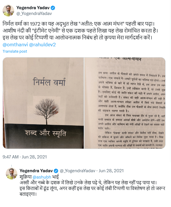 निर्मल वर्मा अकेले ऐसे व्यक्ति नहीं थे जिन्होंने ऐसे प्रश्न पूछे और जो आधुनिक भारतीय बुद्धिजीवियों के संसार में हाशिये पर धकेल दिए गए| ऐसे कई नाम सामने आते हैं, ए के सरन, जे पी एस उबेरॉय, रमेश चन्द्र शाह, दया कृष्ण, धर्म पाल, और आशीष नंदी|