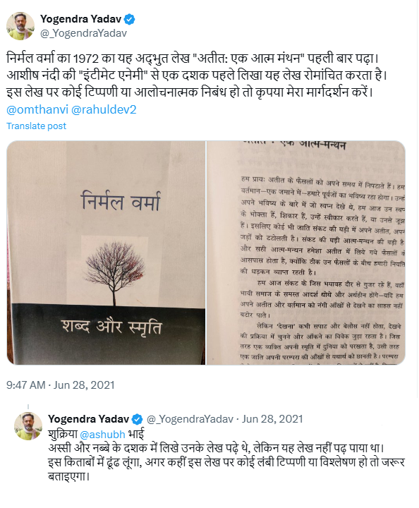 निर्मल वर्मा अकेले ऐसे व्यक्ति नहीं थे जिन्होंने ऐसे प्रश्न पूछे और जो आधुनिक भारतीय बुद्धिजीवियों के संसार में हाशिये पर धकेल दिए गए| ऐसे कई नाम सामने आते हैं, ए के सरन, जे पी एस उबेरॉय, रमेश चन्द्र शाह, दया कृष्ण, धर्म पाल, और आशीष नंदी|