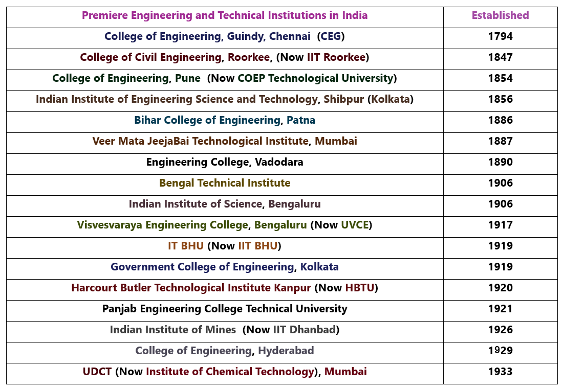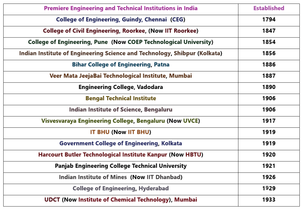 यहाँ यह तथ्य भी गौर तलब है कि भारतीय प्रौद्योगिकी संस्थानों से दशकों क्या सौ वर्ष से ज्यादा बड़ी उम्र वाले तकनीकी संस्थान, जो इंजीनियरिंग की शिक्षा प्रदान करते थे, भारत में अस्तित्व में थे| इन डेढ़ दर्जन इंजिनियरिंग तकनीकी शिक्षा संस्थानों की सूची नीचे दी गयी है|