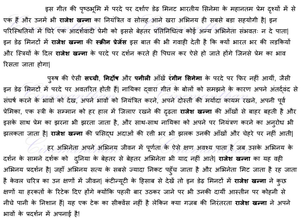 राजेश खन्ना ने बहारों के सपने (1967) से लेकर अनुरोध (1977) के बीच के दस सालों में तकरीबन दो दर्जन हिन्दी फिल्मों में हिन्दी सिनेमा के बेहद अच्छे रोमांटिक दृश्य सिनेमा के परदे पर जीवंत किये, वे संवाद से भरे दृश्य हो सकते हैं, या मौन भरे क्षणों से चमकते दृश्य या परदे पर उनके द्वारा प्रस्तुत या उनकी उपस्थिति में प्रस्तुत किये गीत भी हो सकते हैं, जहाँ उनकी अदाकारी ने उनकी ही अभिनय क्षमता का चरम नहीं छुआ है बल्कि अपने से पहले और अपने बाद आये अभिनेताओं द्वारा एक प्रेमी की भूमिका निभाने की क्षमता के सही मूल्यांकन के लिए सिने-अध्येताओं के सामने एक उच्च स्तर सामने रख दिया है| सिनेमा के परदे पर प्रेम को दर्शाने की उनकी कलाकारी से पहले एक गीत का इतिहास जान लेना आवश्यक है|