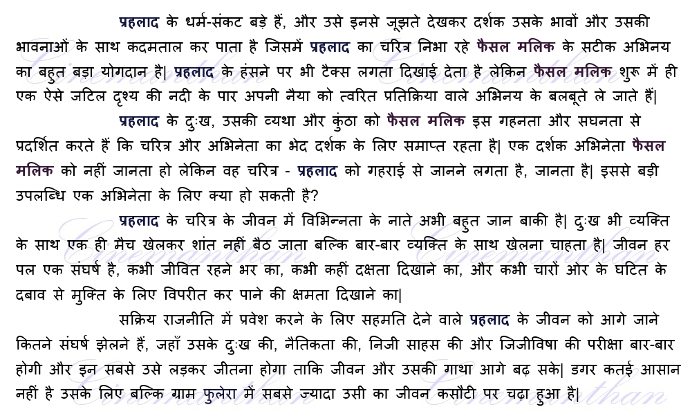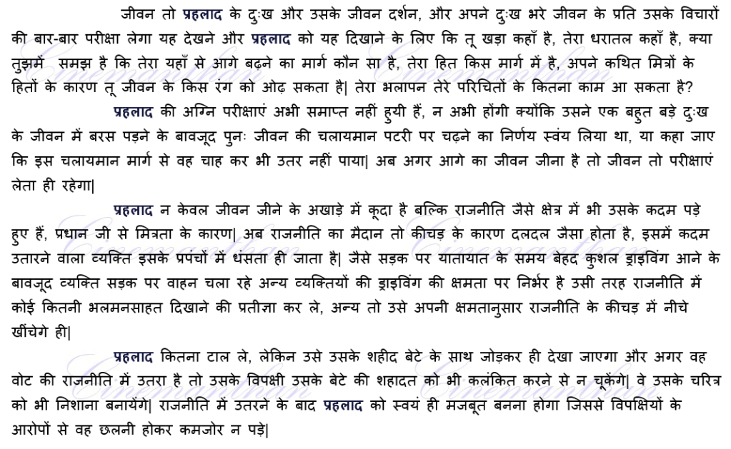 पंचायत के एक रोचक चरित्र प्रहलाद के ऊपर लिखी कहानी, पिछले सीज़न में उसके दुःख के साथ समाप्त हो जाती और पाठक के पास उसका दुःख रह जाता| लेकिन जीवन और जीवन पर आधारित उपन्यासों में ऐसे चरित्र की गाथा आगे बढ़ेगी, क्योंकि उसने आगे जीना ठाना है और जीवन किसी भी व्यक्ति के प्रति अपनी निरपेक्षता और निर्ममता की कसौटियों की धार कम नहीं करता है|