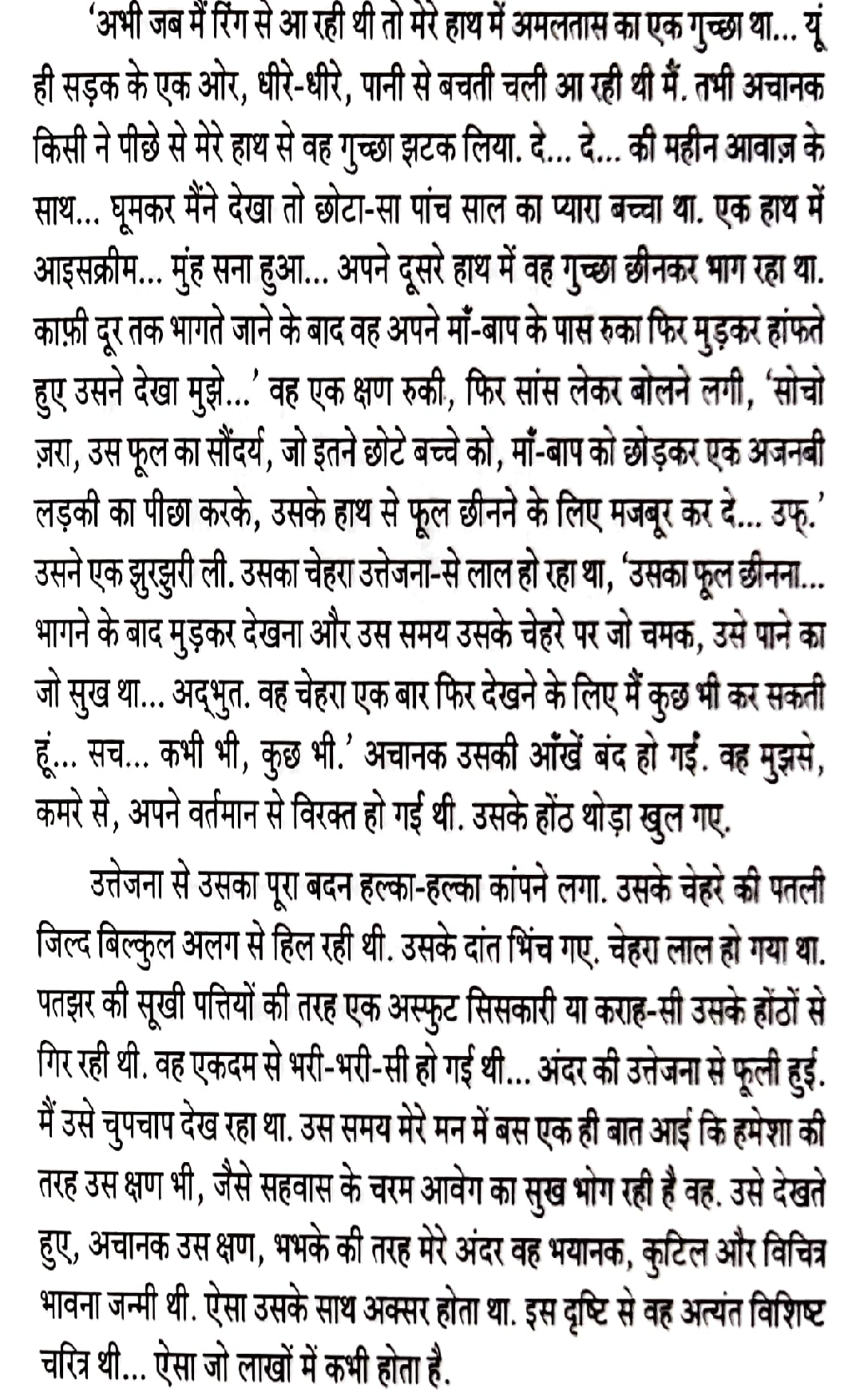 नायक को नायिका द्वारा सुनायी गयी घटना का आकर्षण नहीं मोहता लेकिन उसे सुनाते हुए जिस परम सुख से नायिका गुज़र रही है, वह स्थिति उसे प्रभावित कर जाती है| हालांकि ऐसी स्थितियों से नायिका पहले भी नायक के सामने गुज़रती रही है लेकिन इस बार उसकी स्थिति देख नायक के अन्दर कामना उत्पन्न हो गयी है|