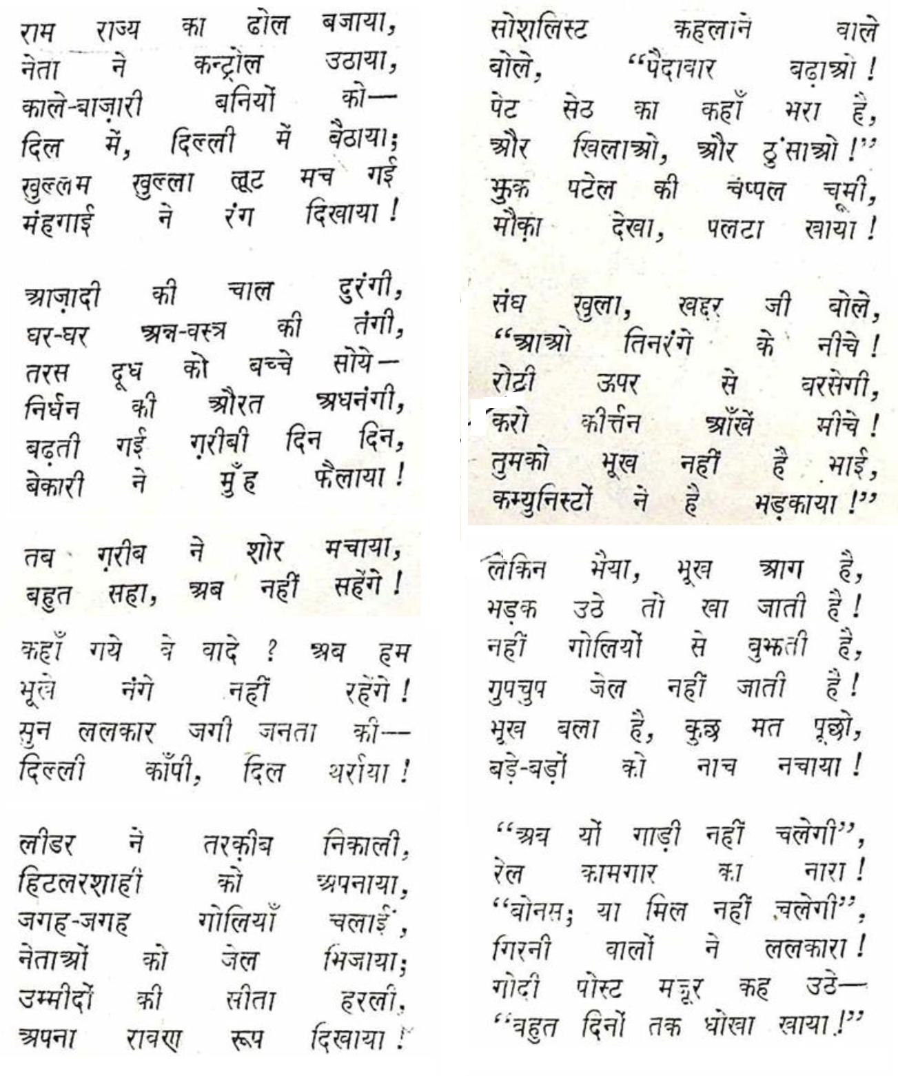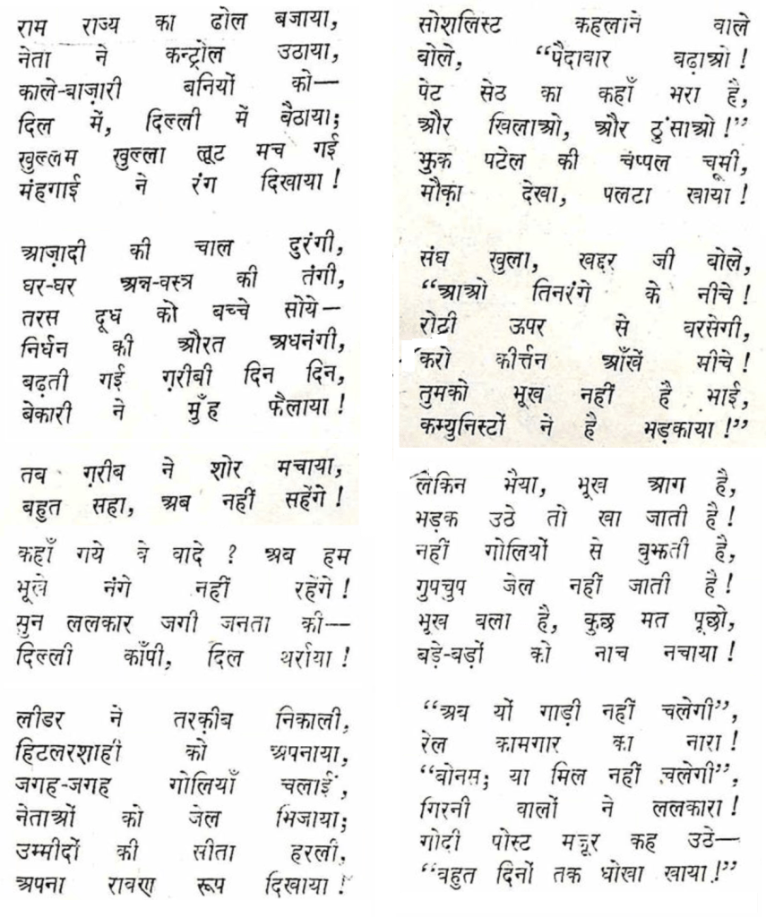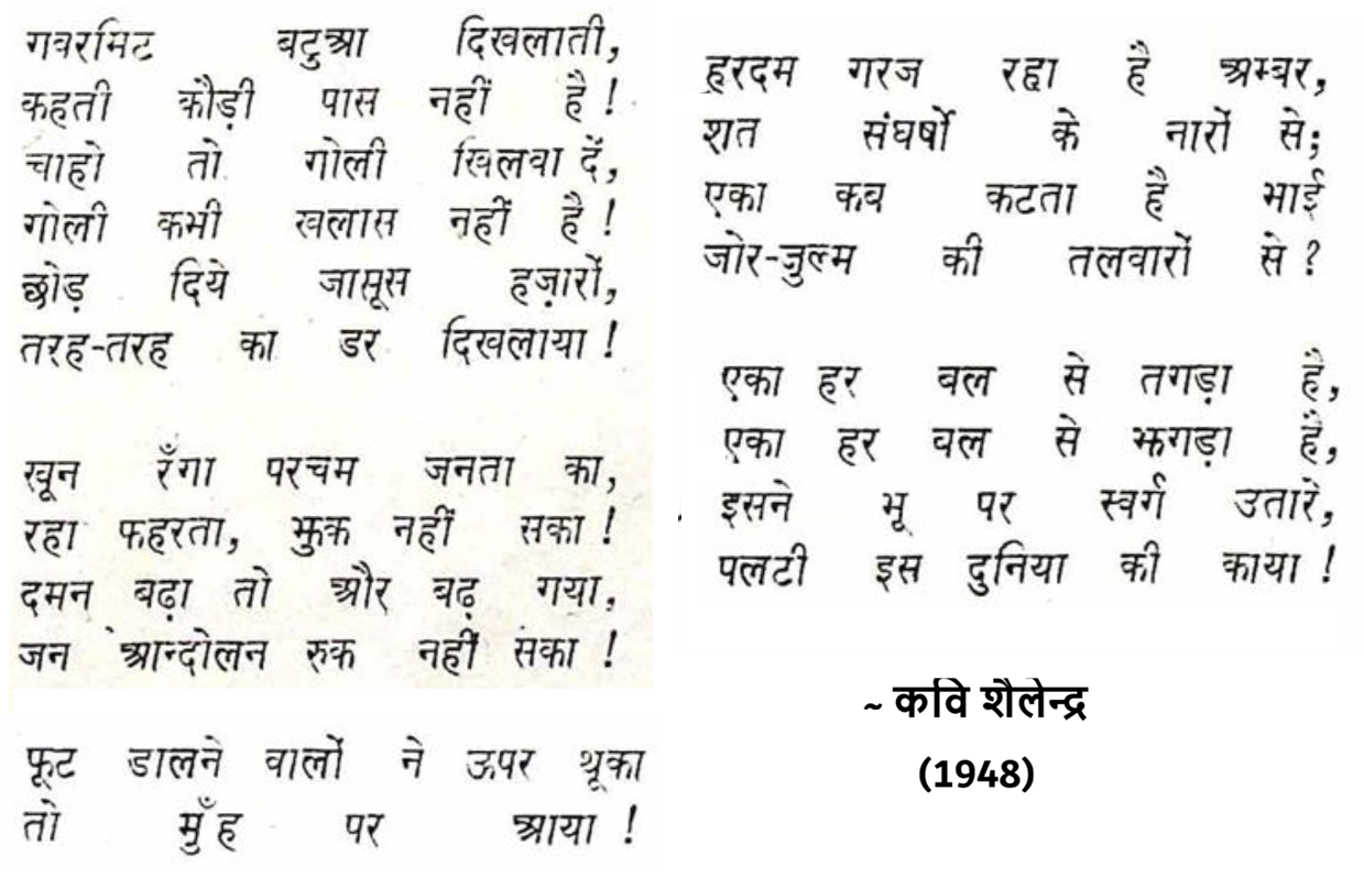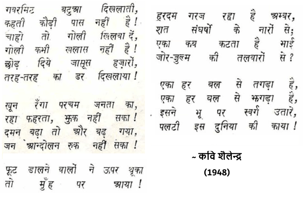 यह एक अविश्वसनीय सा तथ्य है कि कवि शैलेन्द्र ने 1948 में, ब्रितानी राज से स्वतंत्रता मिलने के एक साल बाद ही निम्न प्रस्तुत कविता लिख दी थी| यह आज़ाद भारत के हर दशक की कविता लगती है और आज भी प्रासंगिक लगती है| 1947 के 15 अगस्त के बाद भी उन्होंने 15 अगस्त नमक कविता लिखी थी जिसमें स्वतंत्रता पाए देश से आशाएं थीं, देश को कवि द्वारा दी गयी शुभकामनाएं थीं, देश के कल्याण के लिये मंगलकामनाएं थीं| लेकिन एक ही साल में संभवतः उनका मोह भंग हो गया और उन्होंने वह देख लिया जिसे देखने में अखबारी जगत और बुद्धिजीवी वर्ग ने दशकों लगा दिए| बहुत से तो आज तक पीछे मुड़ कर देखने के बावजूद बीते दशकों के मोह में बिंधे रहते हैं|